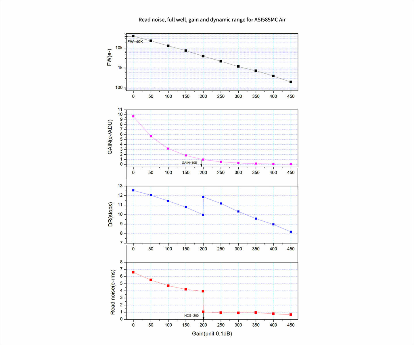 Die Kamera verfügt über einen integrierten HCG-Modus, der das Ausleserauschen bei hoher Verstärkung effektiv reduziert und gleichzeitig den gewohnten großen Dynamikumfang bei niedriger Verstärkung beibehält. Bei einer Verstärkung von 200 schaltet sich der HCG-Modus automatisch ein. Dadurch sinkt das Ausleserauschen auf etwas über 1e-, während der Dynamikumfang weiterhin fast 12 Blendenstufen erreicht.