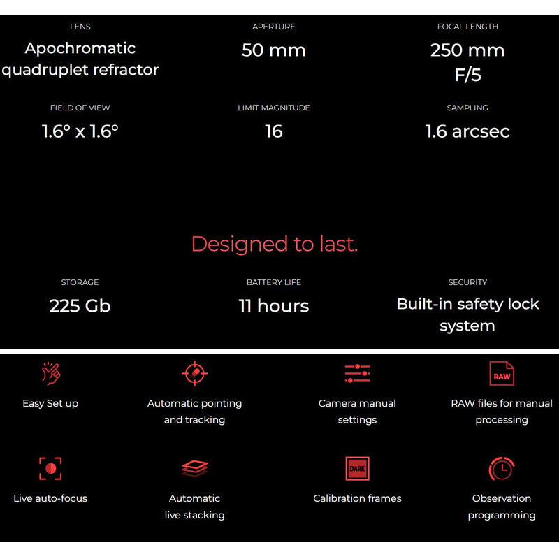 Das Vespera PRO ist ein Refraktor-Teleskop mit apochromatischer Vierfachlinsenkonstruktion und Lanthanglas mit besonders niedriger Dispersion (ULD-Äquivalent S-FPL52). Die Kamera ist mit dem Sony IMX 676 (Farb-)Sensor ausgestattet und das Gerät enthält die gesamte notwendige Software für Autofokus, Plate-Solving und Live-Stacking.